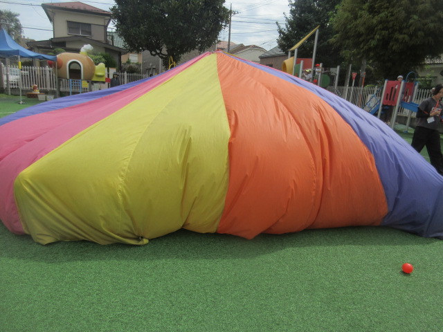 「大きく膨らめ!」を合言葉にパラバルーンに挑戦中!風に負けず、色々な技にチャレンジします!