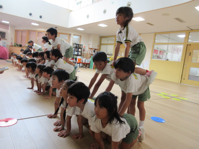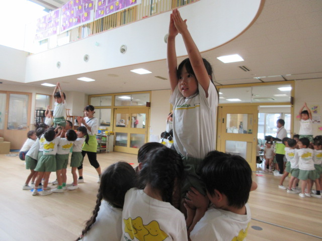 マスゲームに挑戦中!おともだちと息を合わせて、隊形移動をしたり、団体技にチャレンジします!