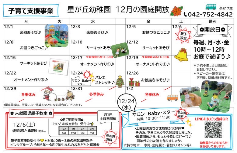 12月12日(金)は、未就園児教室、満3歳児保育 幼稚園説明会が行われます。