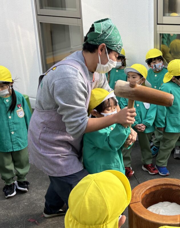 今日は、幼稚園で伝統行事である「お餅つき」が実施されました!