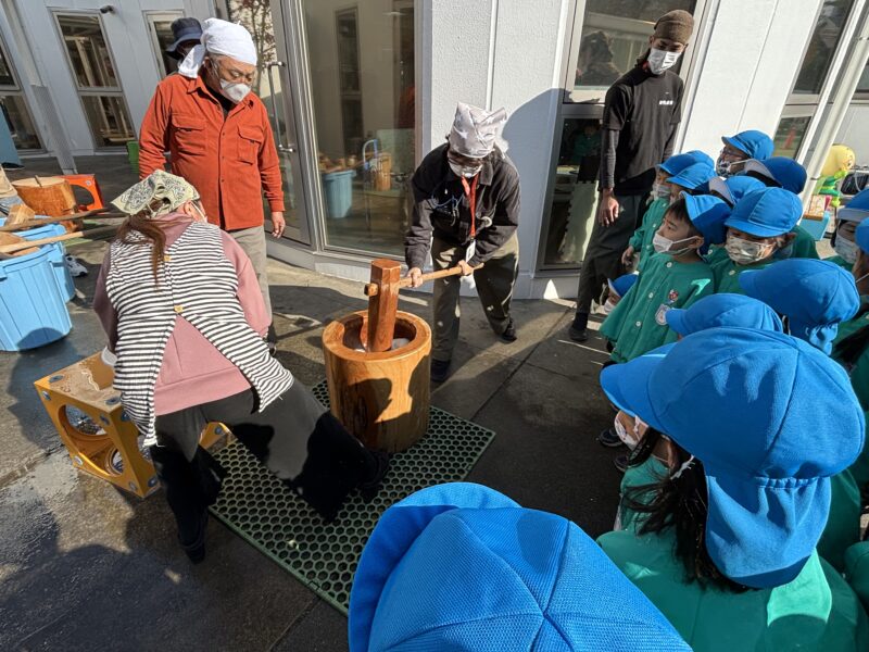 おやじの会のお父さんや、ボランティアの保護者の方にも来て頂き、お餅をペッタン!つき手のお父さん達の格好いい!姿に、おともだちも「お~!」