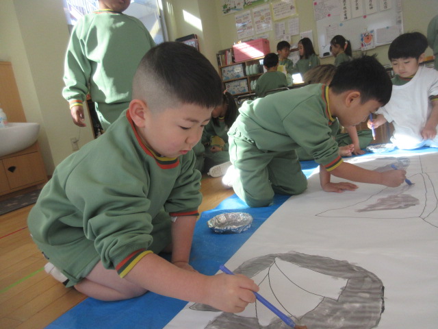 みんなで力を合わせて、絵の具を使って、大道具作り!これがどんな形になるのかは…発表会でのお楽しみ★