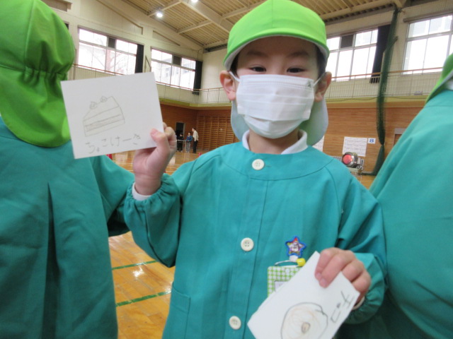 体育館では、沢山のお店の絵カードを準備して下さり、楽しい【お店屋さん】でお買い物体験🎵