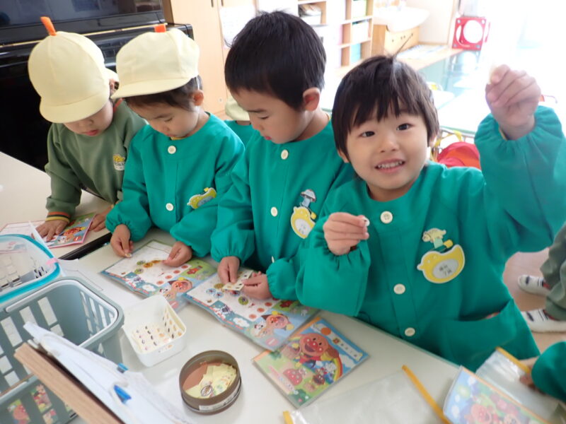登園したら、年少組のシールorみかん組のシール好きなシールを選びシール帳にぺったん!