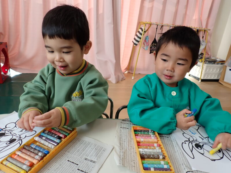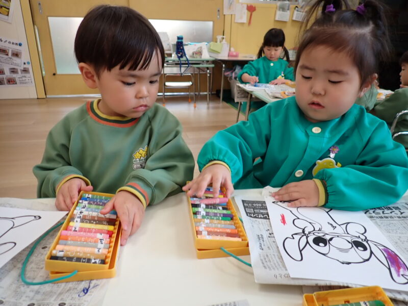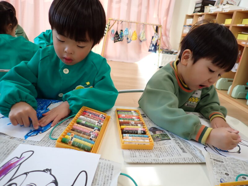 今日は、ICTアートポン「スティッチ」をクレパスで塗ってみよう!