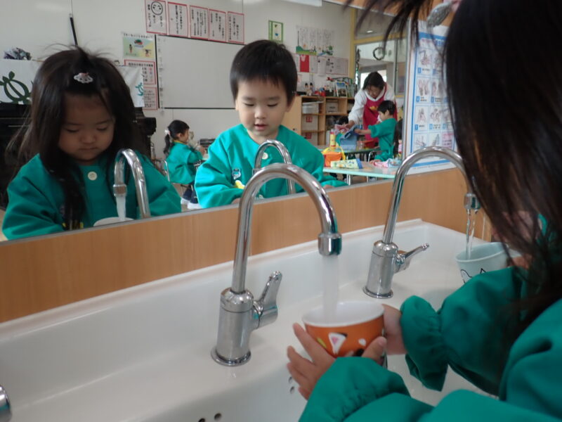 水の出る量を調整しながら上手にコップに注いでいました。