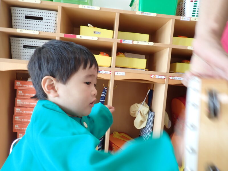 「フックに掛けるの難しいな~。」あきらめずに挑戦して「イイね!!」。指先を使う作業がどんどん上手になるね😊。時間がかかってもやってみることが大切です。お家の方も、ちょっとの我慢が大事!ですね(*^▽^*)。