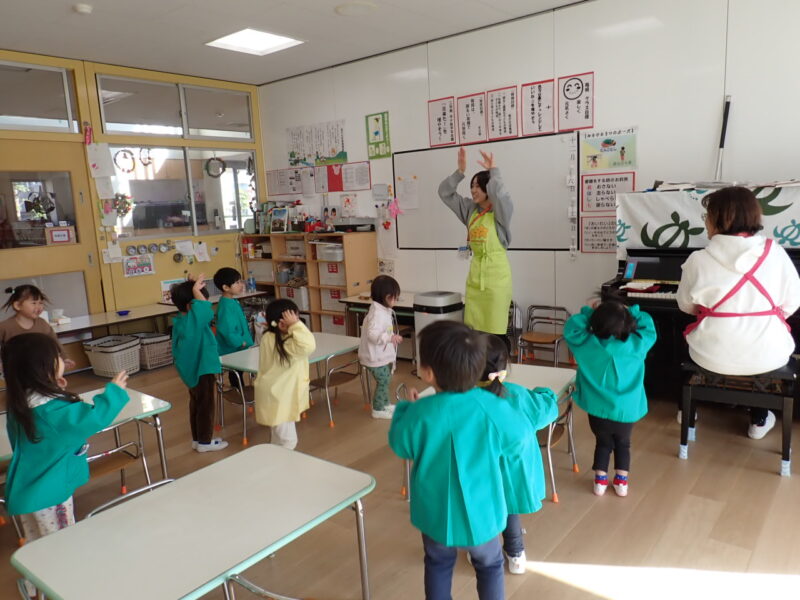 「先生おはよう♪~。」一緒にダンスも楽しみながら、みんなが笑顔で歌を唄いました。