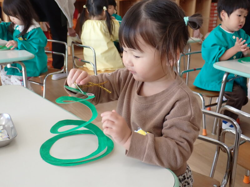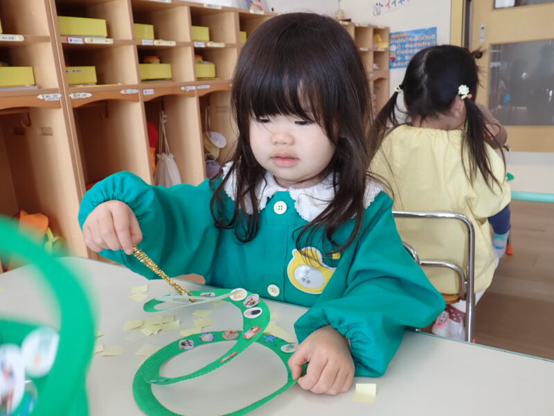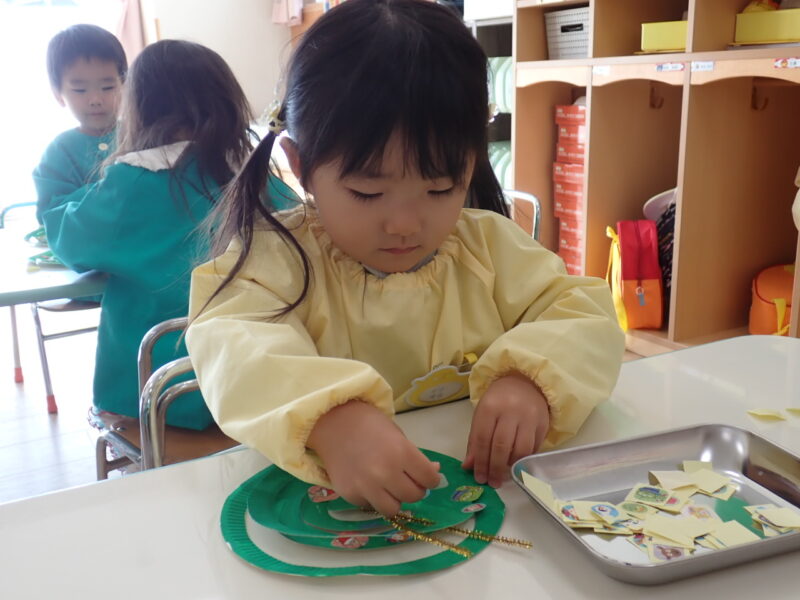 「クリスマスモビー」作りを行いました。シールを沢山貼って素敵に飾り付け🎄。