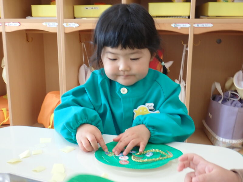 「今日はどこ?」と自分で聞きながら貼ることが出来たね👏。剥した後の紙も、ちゃんとゴミ箱にポイ!って上手に出来ました👏👏。