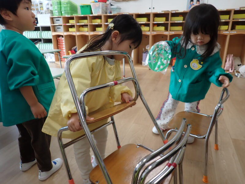 最後は、自分が使った椅子のお片付け。「しっかり両手で持とうね👍。」積み重ねにも挑戦!(^○^)。