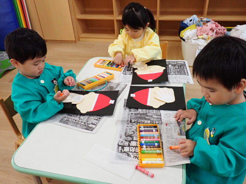 今日は製作遊び!先週とった手形をひげに見立ててサンタさんのお顔にしました✨川崎先生が素敵なお顔を用意してくださったので、お髭を貼って目と鼻をかきました☆
