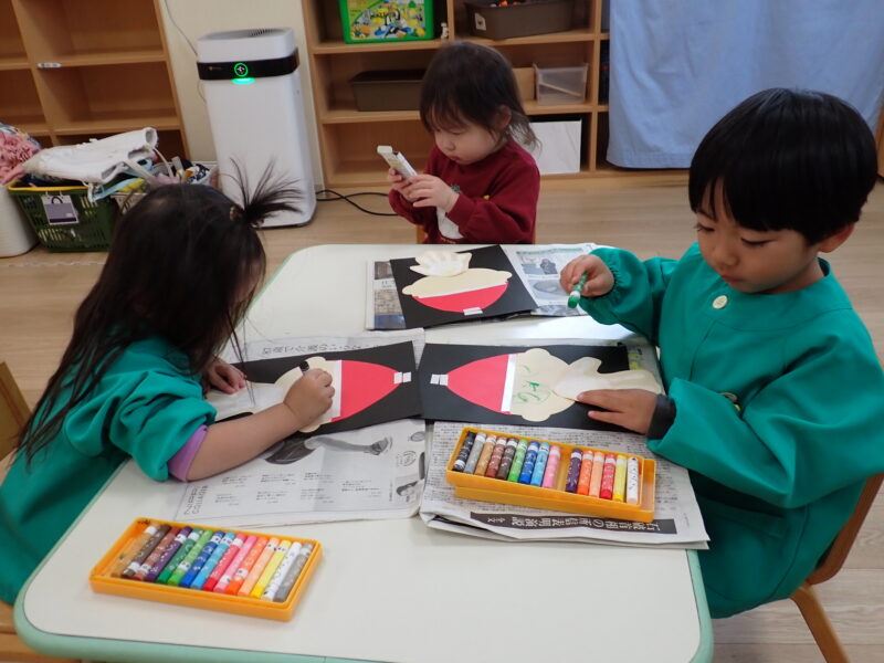 クレパスのお約束①蓋と本体を合体させる。②新聞紙を敷く。(新聞紙には書かない)③クレパスは一本ずつ出し使ったらすぐに戻す。を確認しながら書きました😄