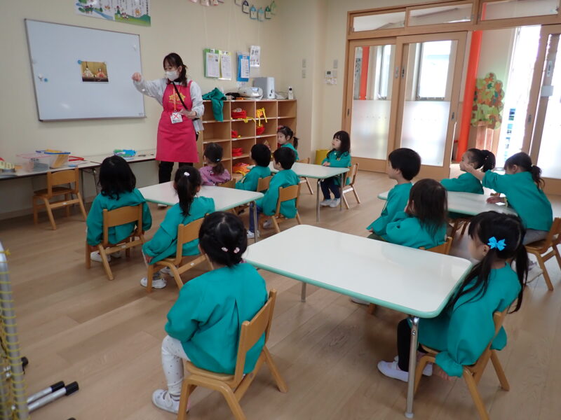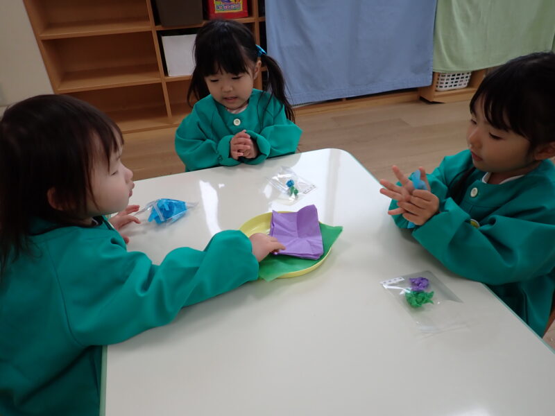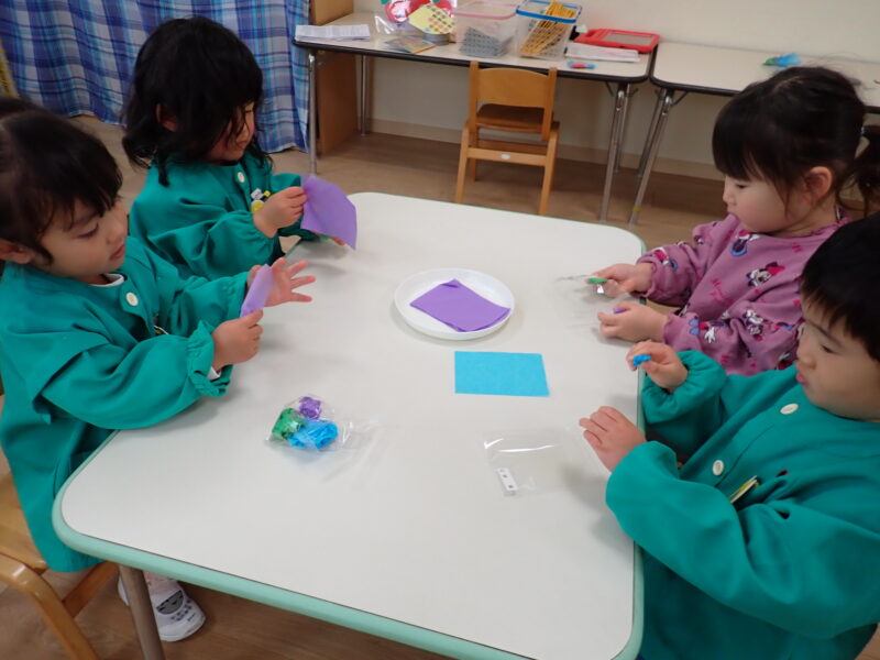朝の会の後はお雛様製作!今日はお雛様の着物の部分を作りました!好きな色の花紙を丸めて袋に入れました!いつもは個別にやることの多い製作ですが、今日は一斉指導で行いました!