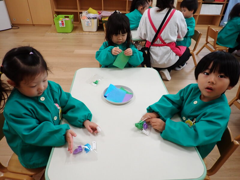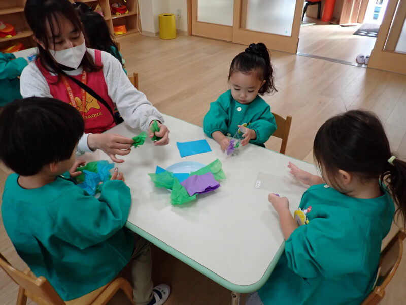 お話を聞いて好きな色を丸めて袋に詰めてぺたん!花紙を一枚ずつ剥がすのに苦戦していましたが、丸めては入れるを繰り返し上手に詰めていました!