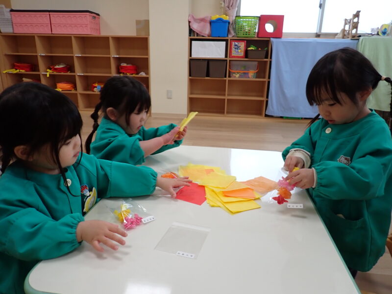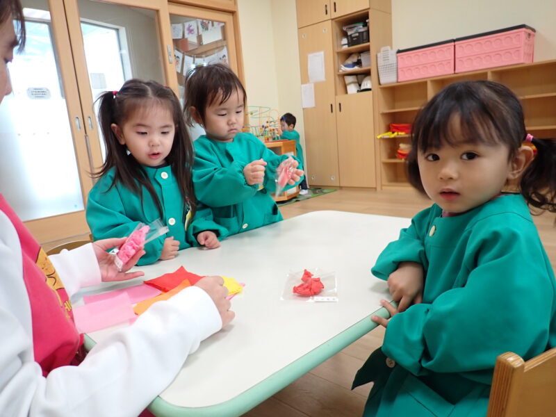 朝の会の後は製作あそび。「お雛様」を作りました。花紙を丸めて袋に詰めて着物に。お顔にはシールを貼りました!