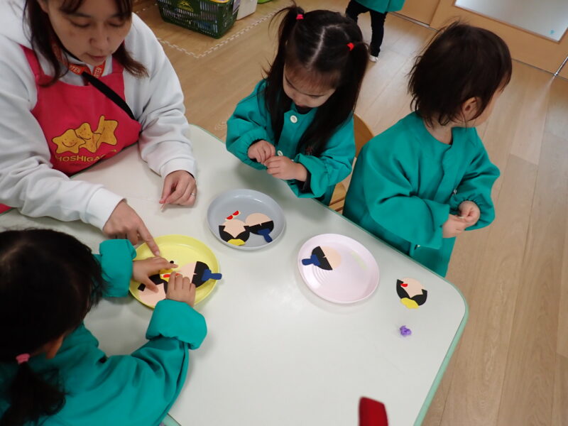 朝の会の後は製作あそび。「お雛様」を作りました。花紙を丸めて袋に詰めて着物に。お顔にはシールを貼りました!