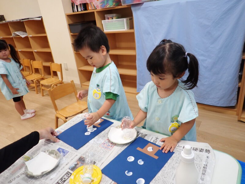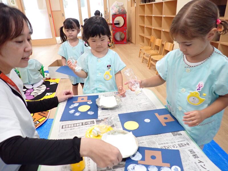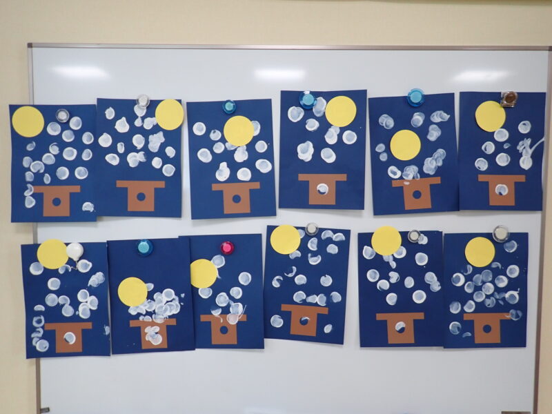 自由遊びと並行して製作あそび🎵今年の十五夜(中秋の名月)は10月6日(月)🌕お月見団子をスタンプで表現しました✨