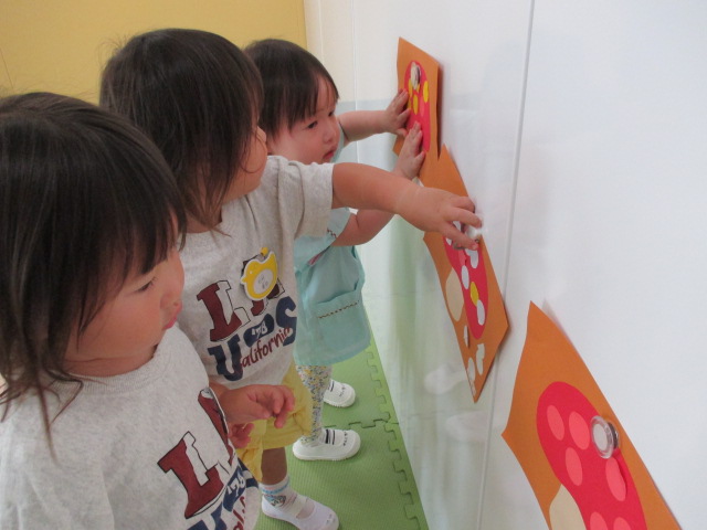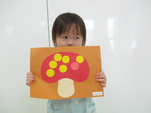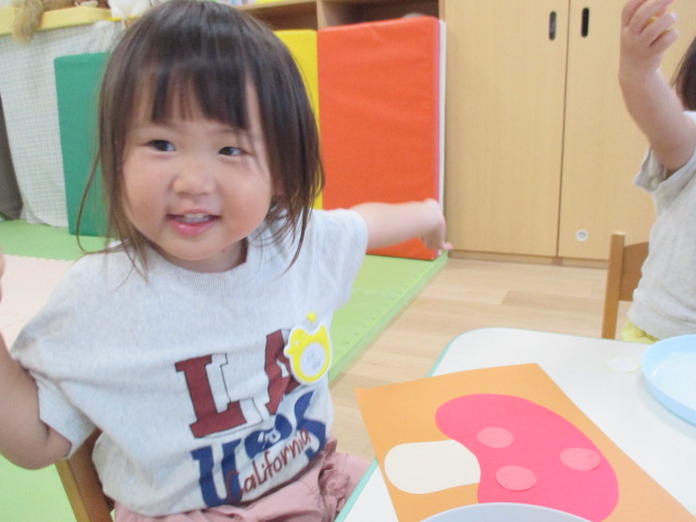 模様が無くて寂しいきのこに、丸いシールを貼ってオシャレに変身✨