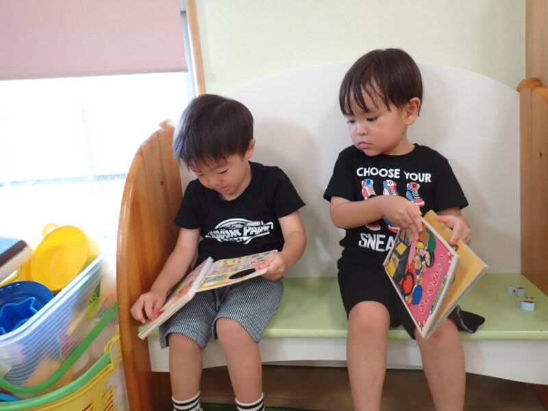 食後の自由遊び時間。クラスメイト仲良く読書の様子。