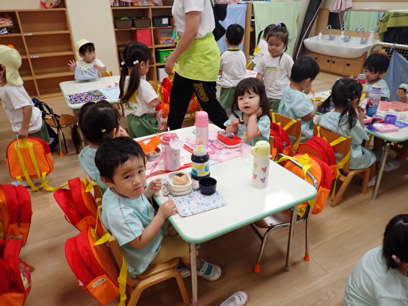 体育あそびに行っていたみかんさんと再び合流してお昼ご飯🍙みかん組のパン給食に興味津々なおともだちも🎵「皆も毎日幼稚園に来るようになったら給食食べられるよ!」と伝えると「毎日来る!」と言っているおともだちもいました(笑)