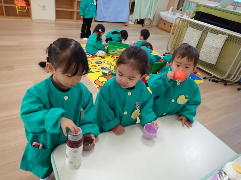今日の2組さん。遊びの合間にお茶タイム!自分でやりたい気持ちを大切に見守っています(*^_^*)