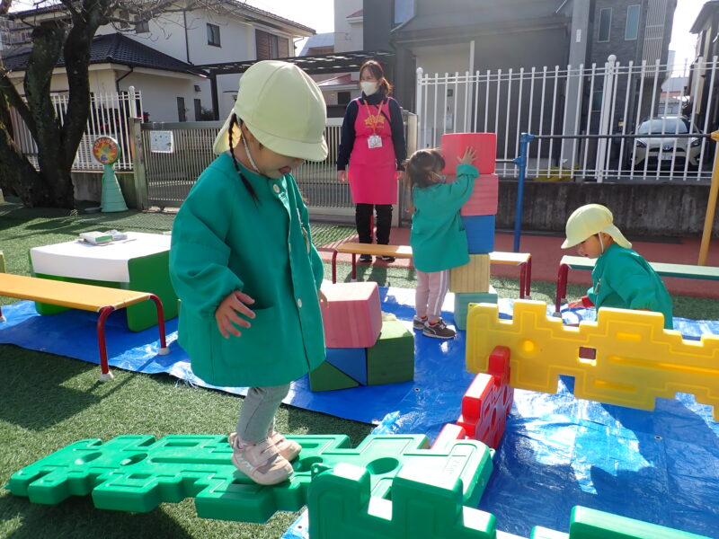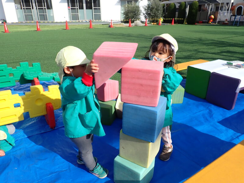 園庭開放の先生が用意してくださったウレタンブロックに夢中だったお友だち!