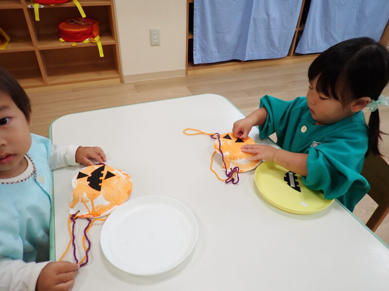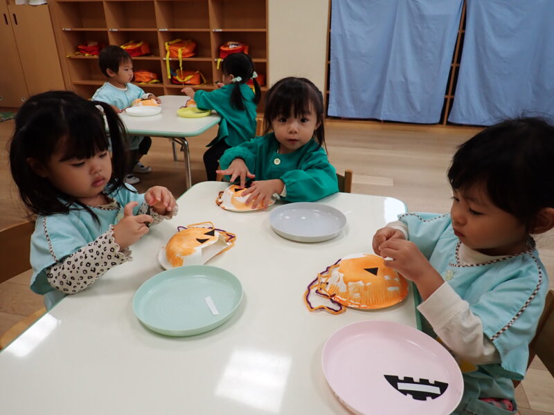 先週色塗りをした紙皿はジャック・オーランタンに変身!今日は目と口を付けました😊