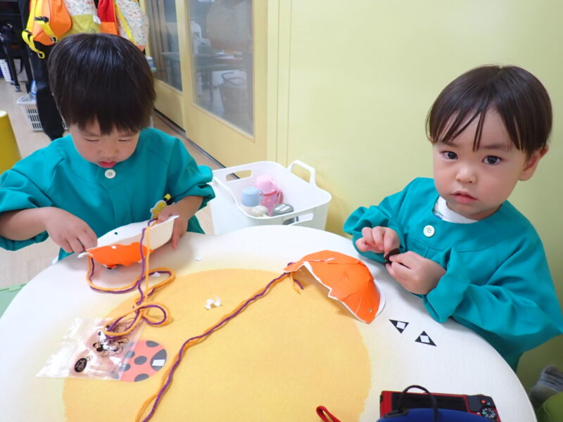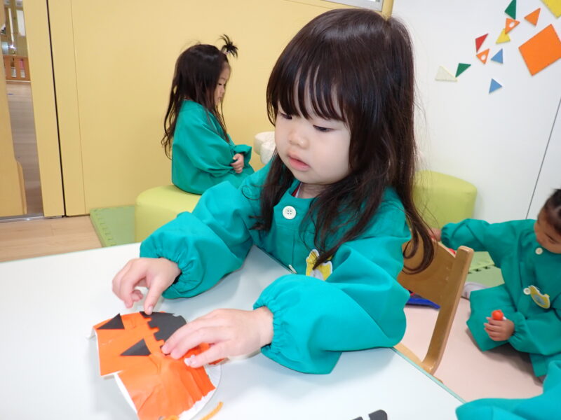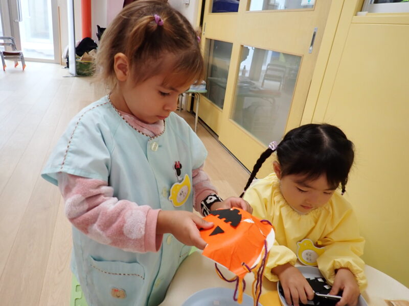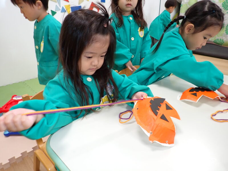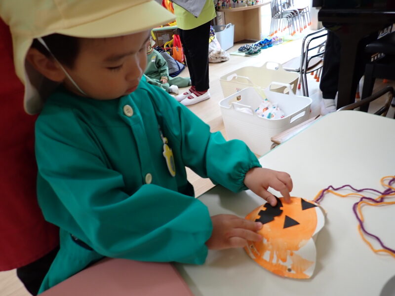 先週の製作の続き!目と口を付け『ジャック・オー・ランタン』に🎃持ち手は毛糸を穴に通しました✨