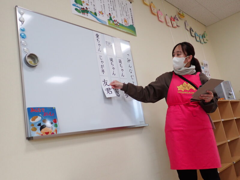 今日は、初めて漢字絵本の活動を行いました。素話では、話を聞きながらホワイトボードに漢字カードが出てきます。文字だけ?と思われるかもしれませんが、お友だちの表情からも、すっごく真剣に聞いているんです!「どんな食べ物が出てきたかな?」と問いかけると、「林檎!」と答えるお友だち。とても良いお耳を持っていますね😄