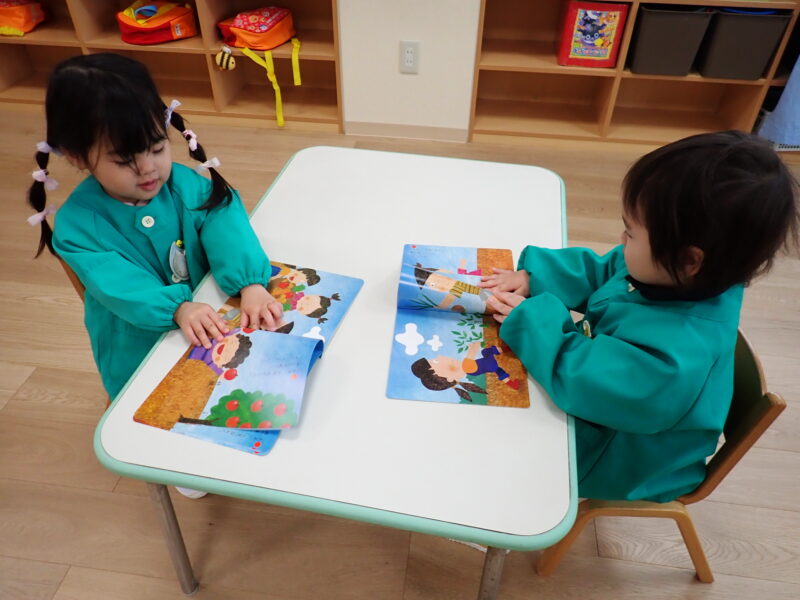実際に自分の絵本を手に取り、どんな野菜や果物が出てきたかを見てみました。「じゃが芋だ!」「お料理してる!」などと、気付きが沢山!