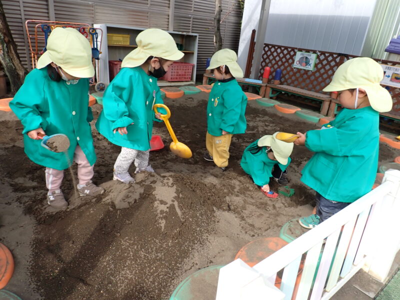 外遊びでは、やっぱり大人気のお砂場。今日はすでに大きな山があり、みんなで登山を楽しんでいました😄(さらさらの砂に足を取られ、遭難しているおともだちも!?(笑))