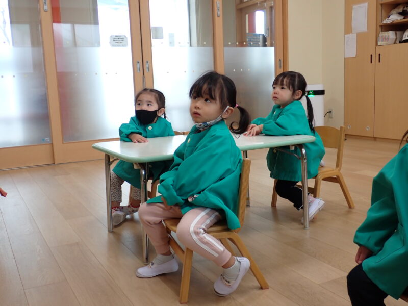 今日は、初めて漢字絵本の活動を行いました。素話では、話を聞きながらホワイトボードに漢字カードが出てきます。文字だけ?と思われるかもしれませんが、お友だちの表情からも、すっごく真剣に聞いているんです!「どんな食べ物が出てきたかな?」と問いかけると、「林檎!」と答えるお友だち。とても良いお耳を持っていますね😄
