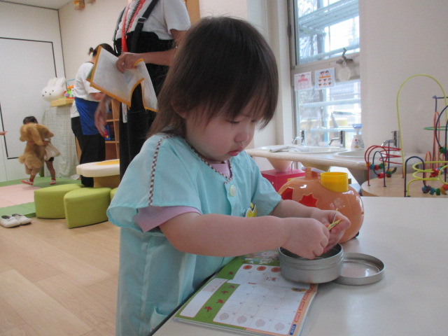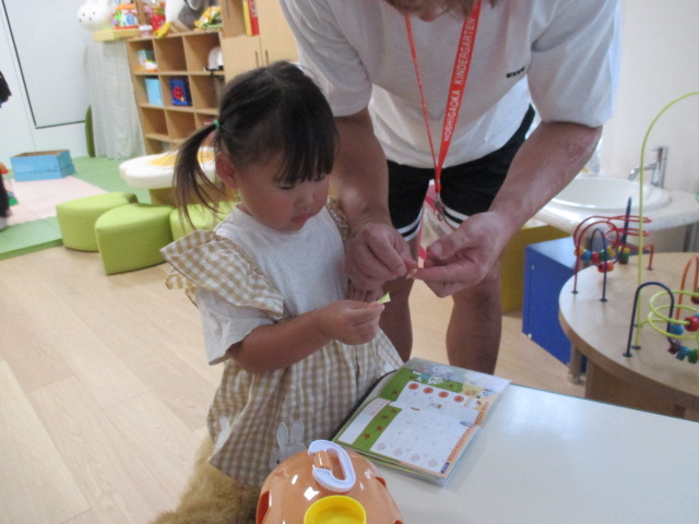 お部屋に着いたら、まずはシール貼り!幼稚園でのルーティンを覚えていけるとい良いですね♪