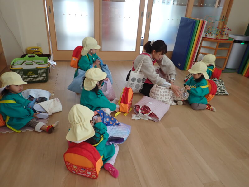 上履きを自分で脱いで上履き袋に入れているおともだち。「出来ない(>o<)」と泣いていたおともだちが今では「出来たよ(^o^)」と教えてくれています✨