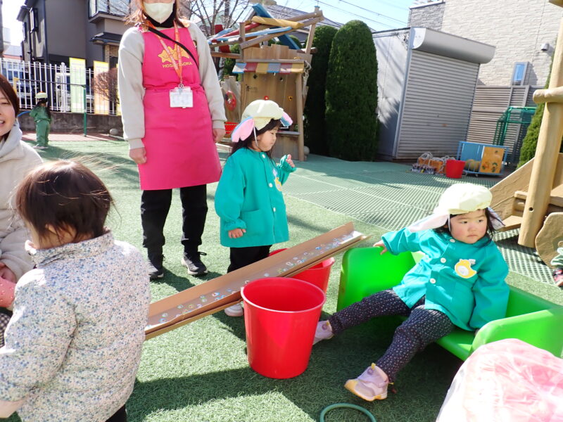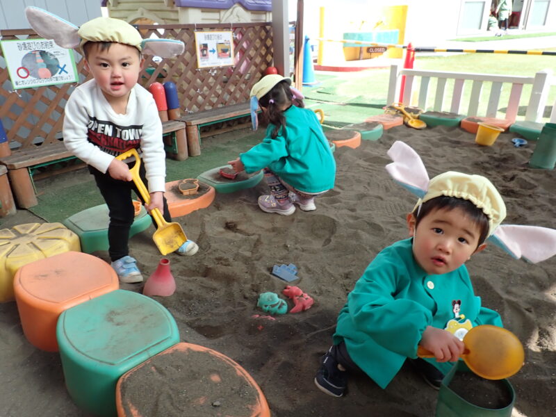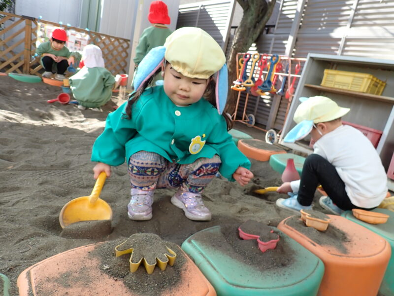 表現遊びの後はお外遊びへ!今日も空気が冷たかったのですが、一番人気はやっぱり砂場。最初に砂場に行くと寒そうだったので園庭で体を動かしてから砂場解禁にしました😄
