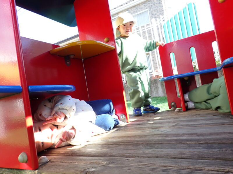 みかん組さんとかくれんぼ。ひよこさん、みかんさんでなければ難しい隠れ場所で、発見!!