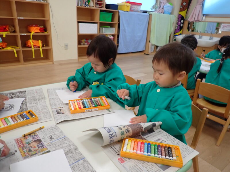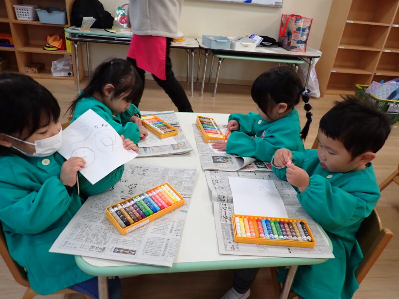 お絵かきでのお約束①新聞紙を敷く。②クレパスは一本ずつ出して描く。を確認しながら描きました!