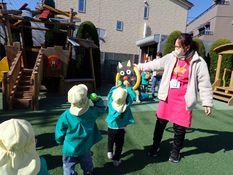 豆の代わりにボールで鬼退治!「鬼は外!!」だよと伝えると狙いを定め鬼退治!