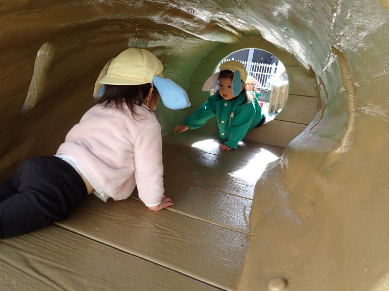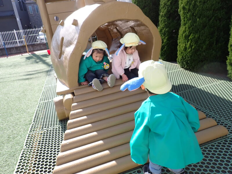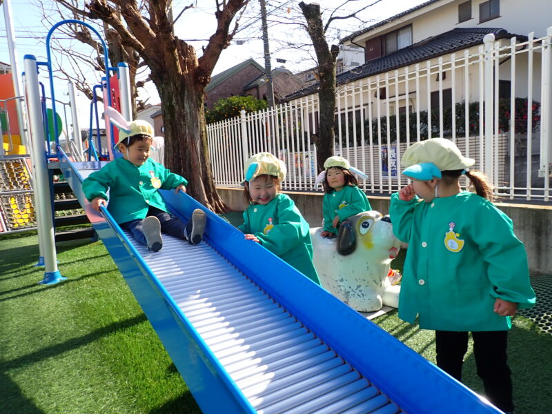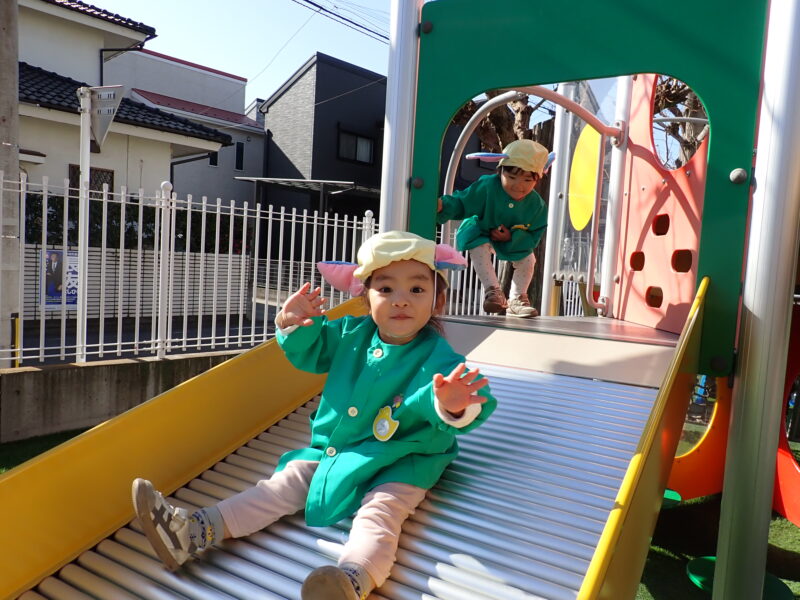 表現遊びを楽しんだ後は朝の会をして外遊び!ローラ滑り台が大人気で競うように滑っていました😄