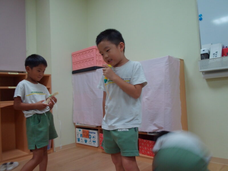 自由遊びの時に、マイクを持ってよし!歌うぞ🎤と意気込んで、、、「はいよろこんで」を歌っていました🎵