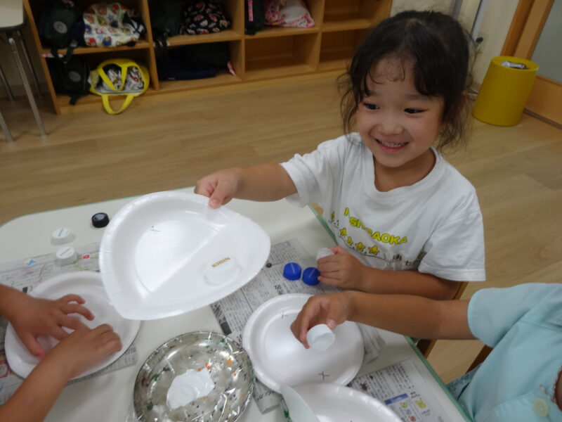最後に、ボンドを使って紙皿とペットボトルキャップをくっけて…