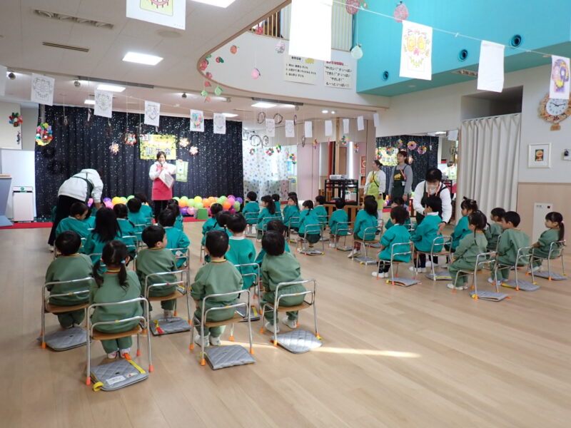 今日は、11月生まれの誕生会。みかん組さんも、”おいわい”の気持ちを持って、参加しました☆