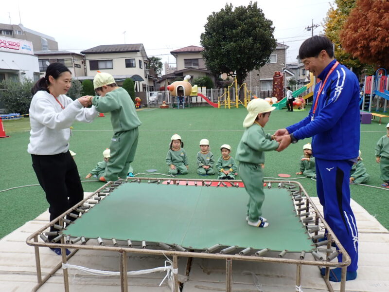 順番順番で、5回ずつ跳びます。先生と手を繋いでいるけれど、自分の力で「ピョーン」と高く上まで。