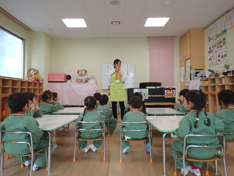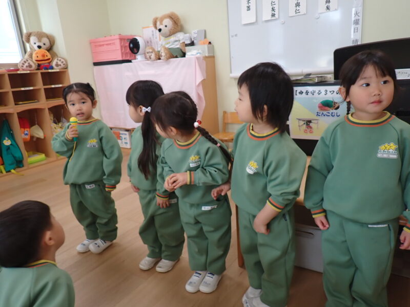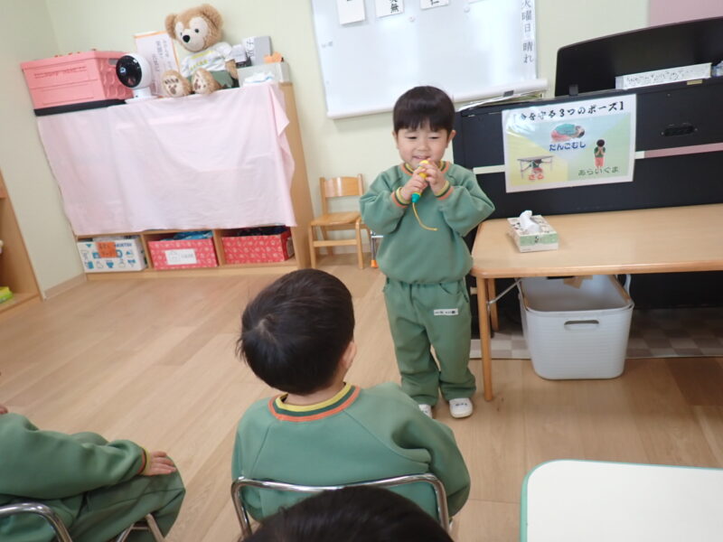 「発表してくれるひと?」と問いかけると、全員の手が「はーい✋」と挙がります。皆の発表を聞きたくて、もう全員に前に出て来てもらう事に。