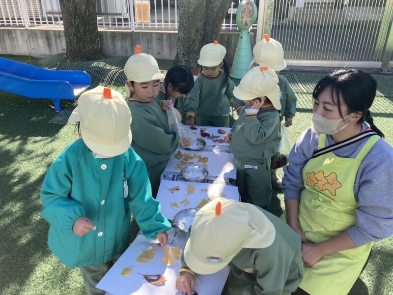 集めた落ち葉を、何か作品に出来ないかな?と笹野先生が、ボンドと画用紙を用意して下さいました。