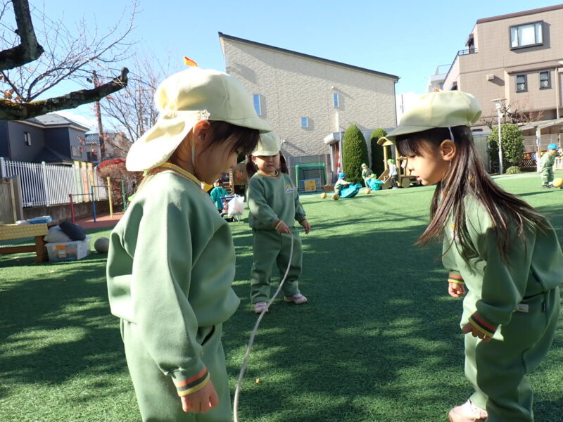 寒さに負けず、外遊び。おともだち同士で長縄跳び。