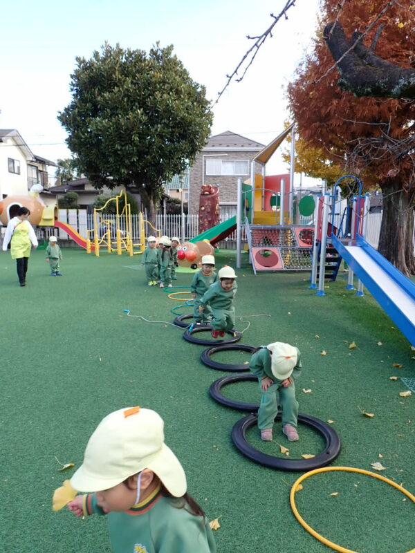 ↓ 外遊びに出ると、タイヤ跳びが準備されていました。もちろん、真っ先にトライ!のみかん組さん。