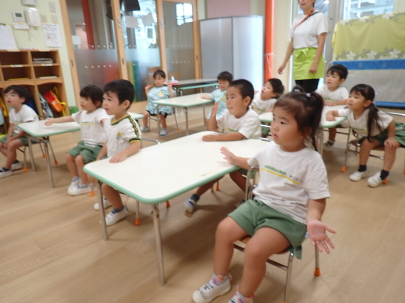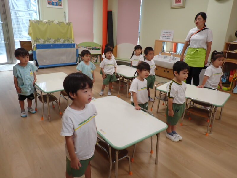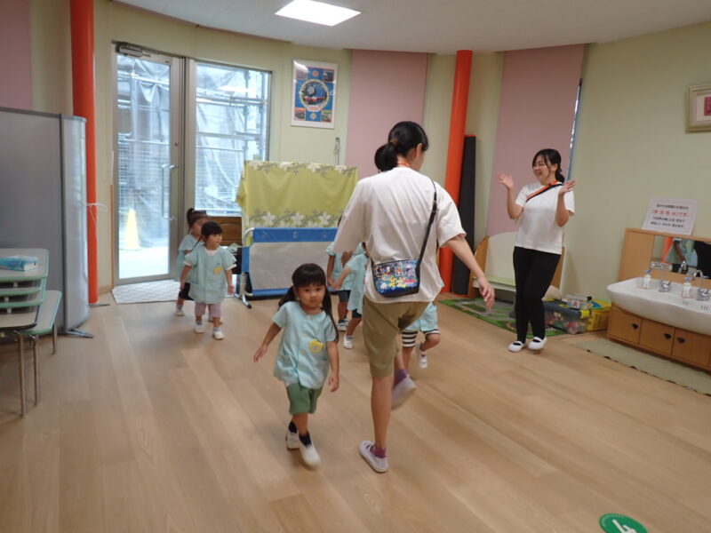 お昼を食べ、こっこ組さんがさよならした後、みかん組さんはもうひと頑張り💪運動会の取り組みで一列並びごっこ✨
