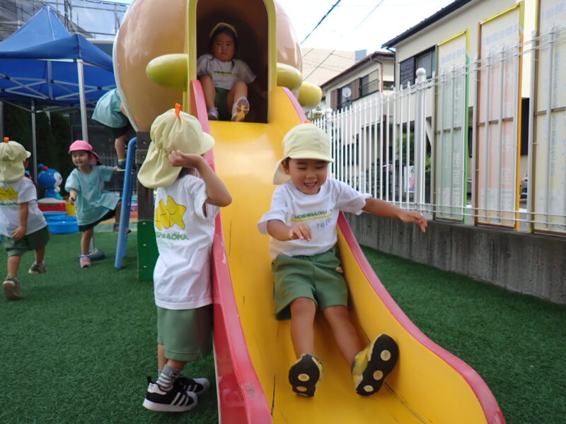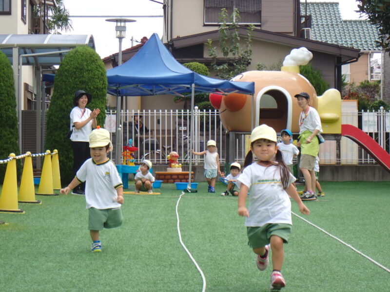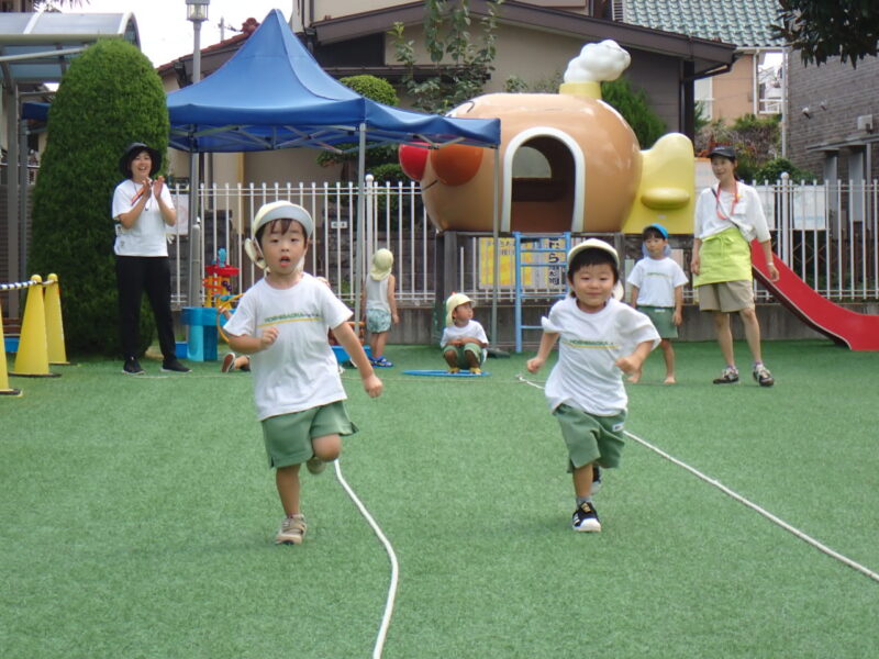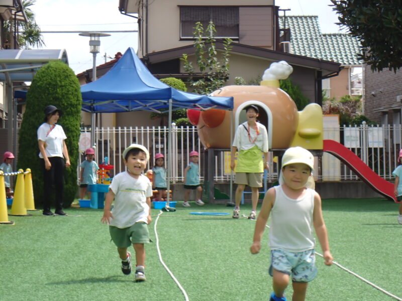 蒸し暑さはあるものの、太陽が隠れて外遊びのチャンス!運動会の取り組みも🏃「位置について ヨーイ ドン!」の練習も✨ヨーイで足を下げ走るポーズを教えてもらいました!